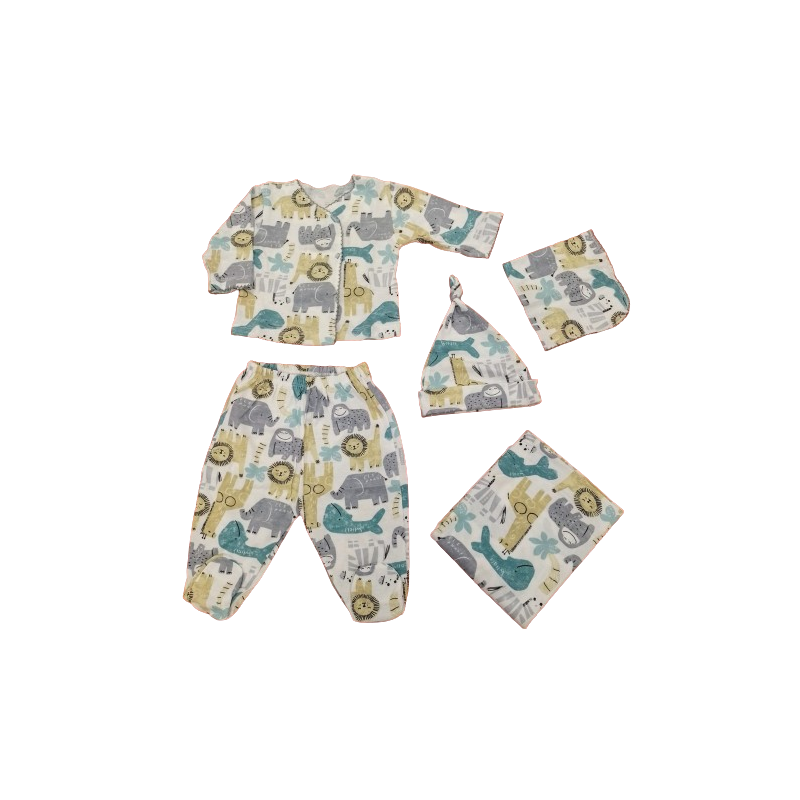 Ajuar en algodón estampado, compuesto por: manta + batita + ranita + gorro + babita. Talle Recién nacido (0/2 mese)
